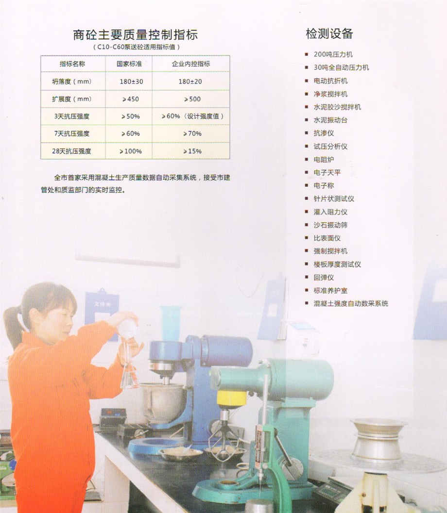 公司設有先進的實驗室,配備全套混凝土及原材料檢測試驗設備,配有專職的試驗、檢驗人員,可承擔混凝土的材料性能試驗,工藝質量控制、產品質量檢驗等全部試驗、檢驗項目,為確;炷临|量提供了可靠的保證。